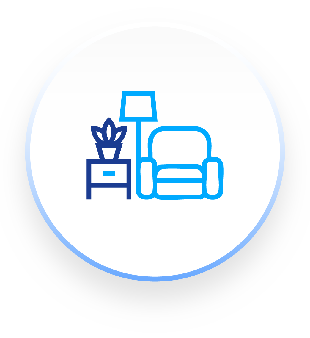 Sofas, tables, chairs, lamps, couches, beds, desks, cabinets, benches, etc.